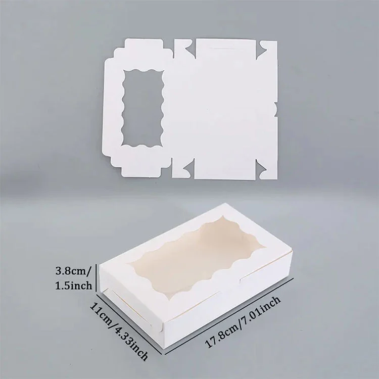 स्वादिष्ट पेस्ट्री, चॉकलेट, कपकेक और केक प्रदर्शित करने के लिए बिल्कुल उपयुक्त, स्पष्ट खिड़की वाले इन खूबसूरत केक बक्सों के साथ अपनी बेकरी पैकेजिंग को उन्नत करें। जन्मदिन, शादी, वेलेंटाइन डे और अन्य विशेष अवसरों के लिए आदर्श, ये बक्से प्रीमियम सौंदर्य के साथ कार्यक्षमता को जोड़ते हैं। उच्च गुणवत्ता वाली सामग्रियों से निर्मित, वे आपके ब्रांड की प्रस्तुति को बढ़ाते हुए ताजगी सुनिश्चित करते हैं। एक यादगार अनबॉक्सिंग अनुभव बनाने के लिए आपके लोगो, रंगों और डिज़ाइन के साथ पूरी तरह से अनुकूलन योग्य।